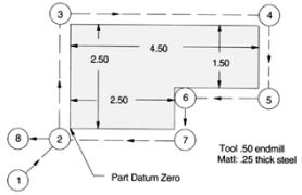A primeira linha, N0010 posiciona rapidamente a ferramenta longe do canto esquerdo inferior da peça. Na segunda linha, N0020, G01 move a ferramenta para uma posição que seja valor de 1 raio da ferramenta à esquerda do lado da peça (X-.25). A ferramenta de move com 10 polegadas por o minuto (F10). Ela está alinhada agora com o canto esquerda da peça. A linha 30 corta o lado esquerdo da peça e posiciona o centro do eixo de corte além do topo da peça do valor de 1 raio da ferramenta (Y3.25). Isto posiciona a borda da ferramenta para o corte da parte superior da peça. A linha 40 corta o topo da peça. A taxa de alimentação (movimento) é ainda 10 polegadas por o minuto porque nós não a mudamos desde a linha número 20. O centro do eixo é agora posicionado a .25 além da direita da peça. Isto prepara para o corte do lado direito da peça. A linha 50 posiciona a ferramenta no ponto 5. O lado direito da peça está agora completo. O centro da ferramenta também é posicionado a 1 raio abaixo da parte inferior da peça, pronto para iniciar outro corte. A linha 60 corta então o fundo da peça e movimenta a ferramenta completamente fora da área da peça (X.50). Agora, consideremos as partes individuais de um programa de peça por palavras-chave.
