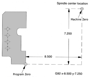 Locação da Peça (Zero da Peça a Trabalhar): para programar uma peça, o programador deve determinar onde a referência zero da peça está localizada. Este zero é uma característica da peça que define a maioria das dimensões da peça. Todas as dimensões da peça mostrada na figura precedente vêm do canto inferior esquerdo, que é a escolha lógica para o ponto zero. Bons programadores escolhem uma característica da peça que seja fácil de se usar.