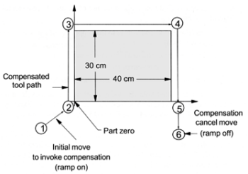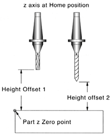 Offset de Comprimento da Ferramenta: Os offsets de comprimento de ferramenta tornam possível ao controlador se ajustar aos diferentes comprimentos de ferramenta. Cada ferramenta pode possuir um comprimento diferente, mas os controles da máquina do CNC permitem tratar este problema facilmente. Os controladores do CNC têm uma área de memória especial para armazenar offsets de comprimento de ferramenta. O offset de comprimento de ferramenta estabelece a distância da ponta da ferramenta na posição “home” até a posição zero (em z) da peça a trabalhar (veja a figura seguinte). Esta distância é armazenada em uma tabela que o programador pode acessar usando um palavra-chave tipo G ou um código da ferramenta. Uma máquina ferramenta que tenha um controle Fanuc usa o código G43. A palavra-chave G43 é acompanhada por uma letra auxiliar H e por um número do dois dígitos. O G43 diz ao controle para compensar o eixo-z, e o H e o número informam ao controle qual offset deve chamar da tabela de armazenamento de comprimentos da ferramenta. Um comando do tipo offset de comprimento da ferramenta é tipicamente acompanhado por um movimento no eixo-z para ativá-lo.